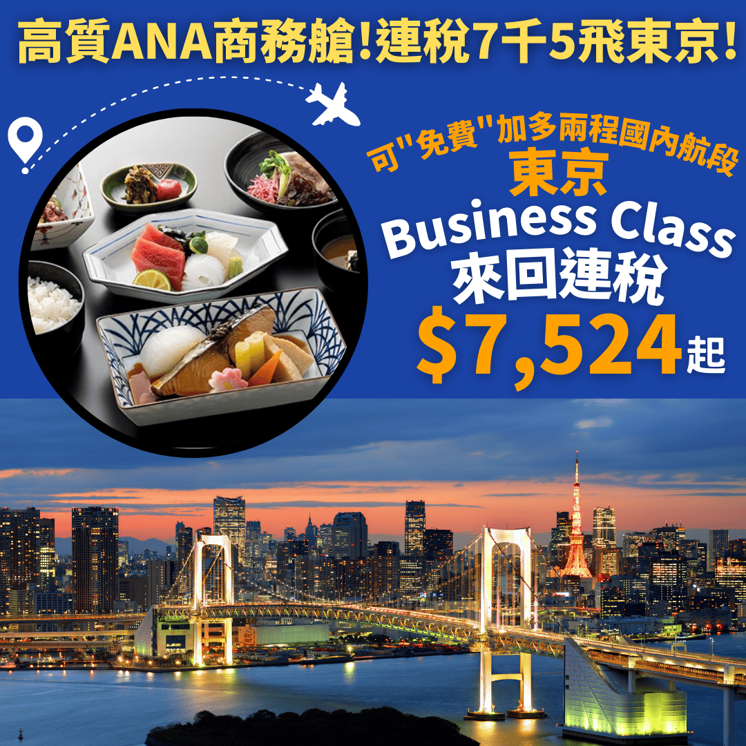 高質ANA商務艙!連稅7千5飛東京!明年5月31日前出發!可”免費”加多兩程國內航段!包2件各32kg寄艙行李!香港飛東京商務艙來回連稅$7,524起 – ANA全日空 (優惠至9月9日)