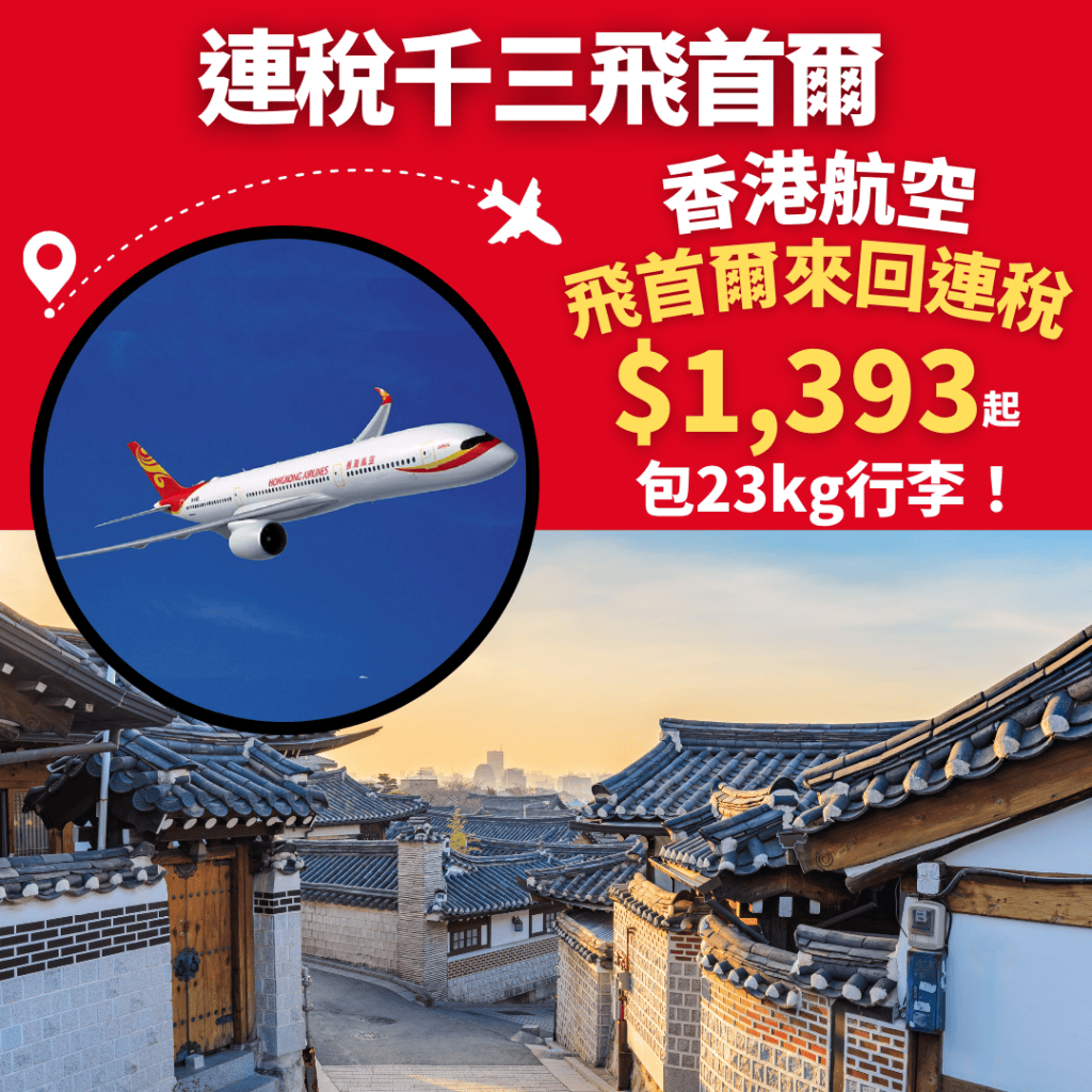連稅千三飛首爾!包23kg寄艙行李!12月17日前出發!香港飛首爾來回連稅只需$1,358起 – 香港航空 (優惠至8月31日)