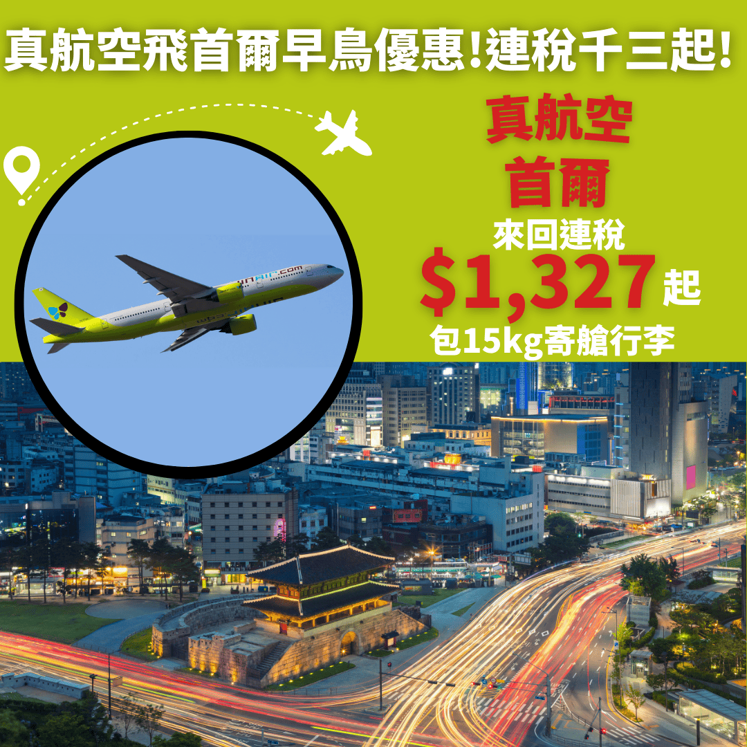 暑假旺季連稅千三飛首爾!10月25日前出發!包15kg寄艙行李!香港飛首爾來回連稅只需$1,327起 – 真航空 Jin Air (優惠至2月20日)