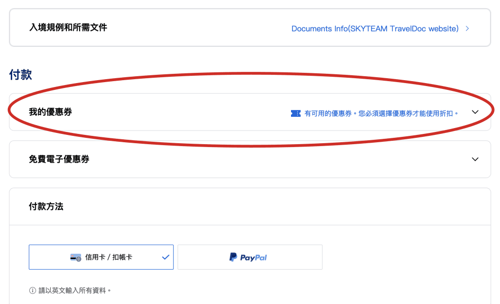 提提大家,折扣代碼要係輸入完旅客資訊同聯絡資訊後,去到付款嗰版係”我的優惠券”嗰度輸入 (如下圖所示)
