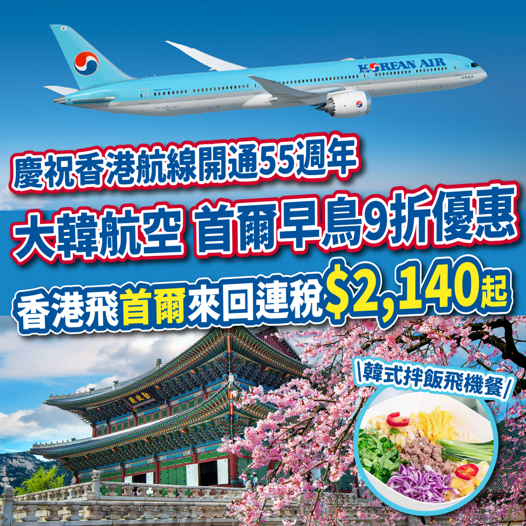 大韓航空為慶祝香港航線開通55週年推出咗首爾機票早鳥9折優惠!