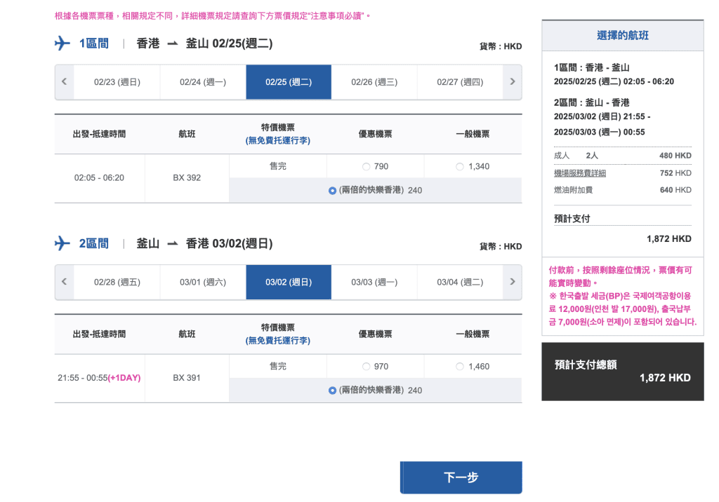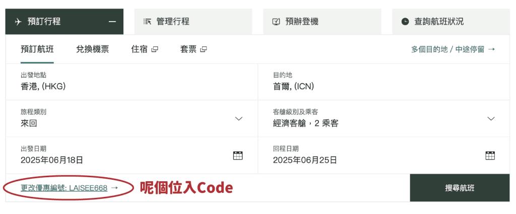 https://www.koreanair.com/booking/search (折扣代碼:KEHK2025)