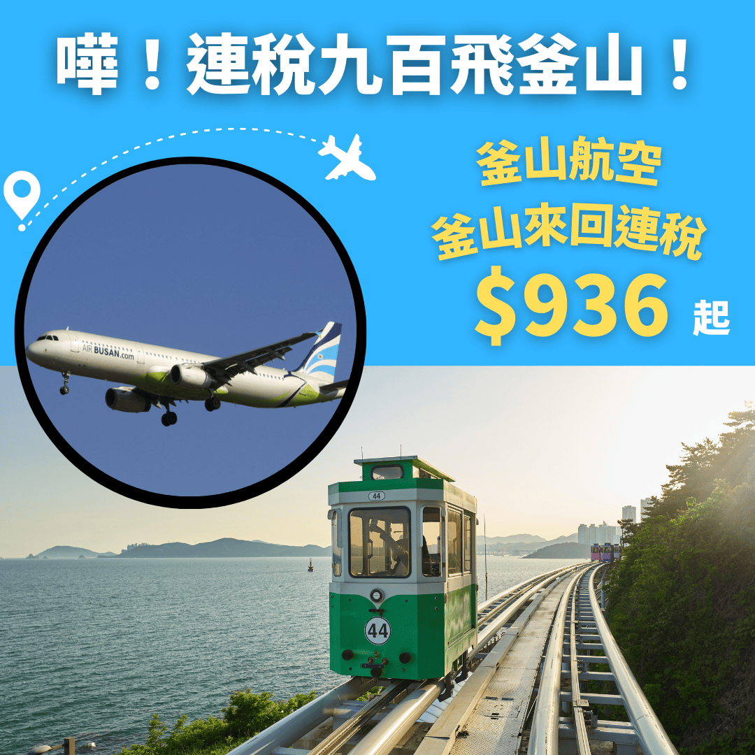 香港飛釜山二人同行單程每人只需$240起,來回連稅$936起