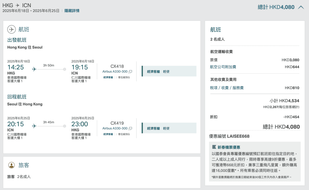 9折後,香港飛首爾二人同行來回連稅每人$2,040起,包23kg行李