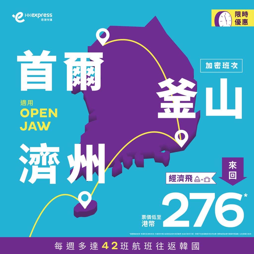 韓國限時優惠!明年7月9日前出發!香港飛首爾、釜山、濟州單程只需$108起 – HK Express (優惠至11月24日)