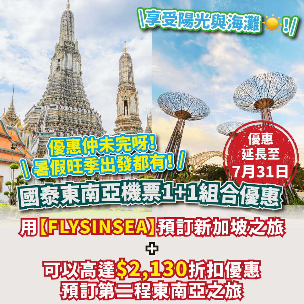 個優惠仲未完呀!暢遊東南亞之旅!國泰東南亞機票1+1組合優惠!暑假旺季出發都有!先預訂新加坡之旅+享高達$2,130折扣^預訂第二程東南亞之旅 – 國泰航空 (優惠至7月31日)