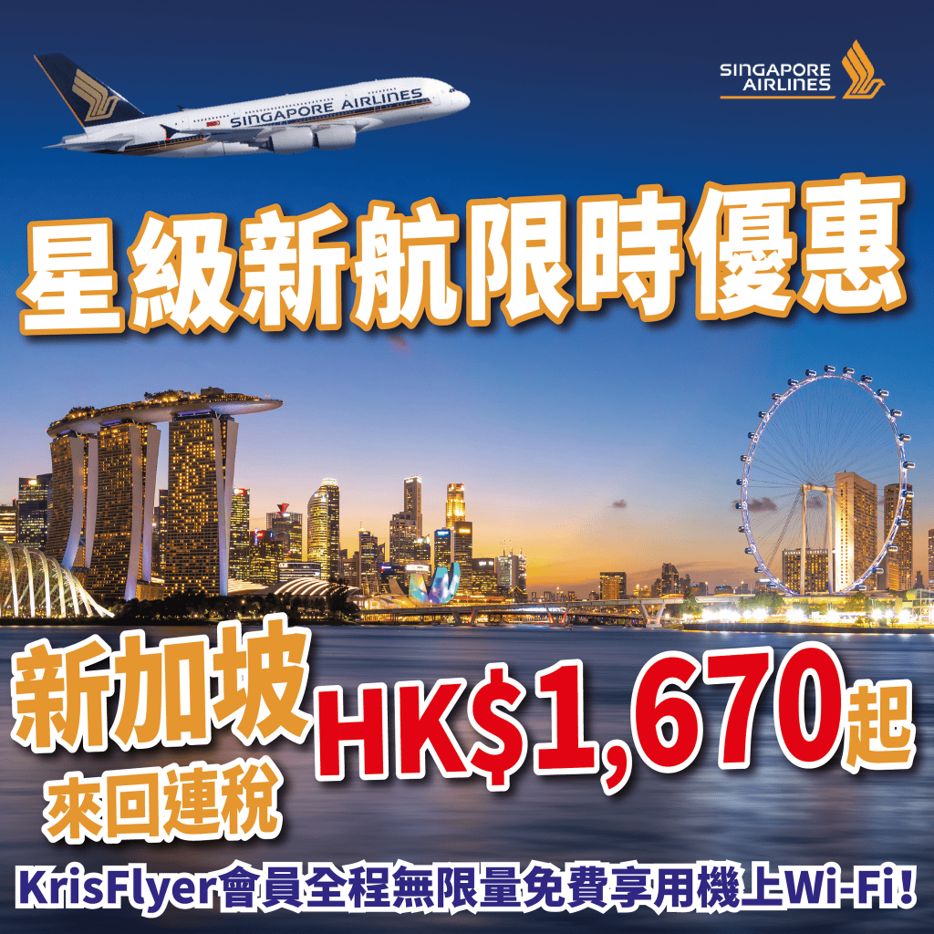 跟新航一同編織你嘅夢幻假期!飛新加坡連稅千六起!限時優惠!香港飛新加坡來回連稅HK$1,665起、澳洲HK$4,260起、馬爾代夫HK$5,240起!KrisFlyer會員全程無限量免費享用機上Wi-Fi!