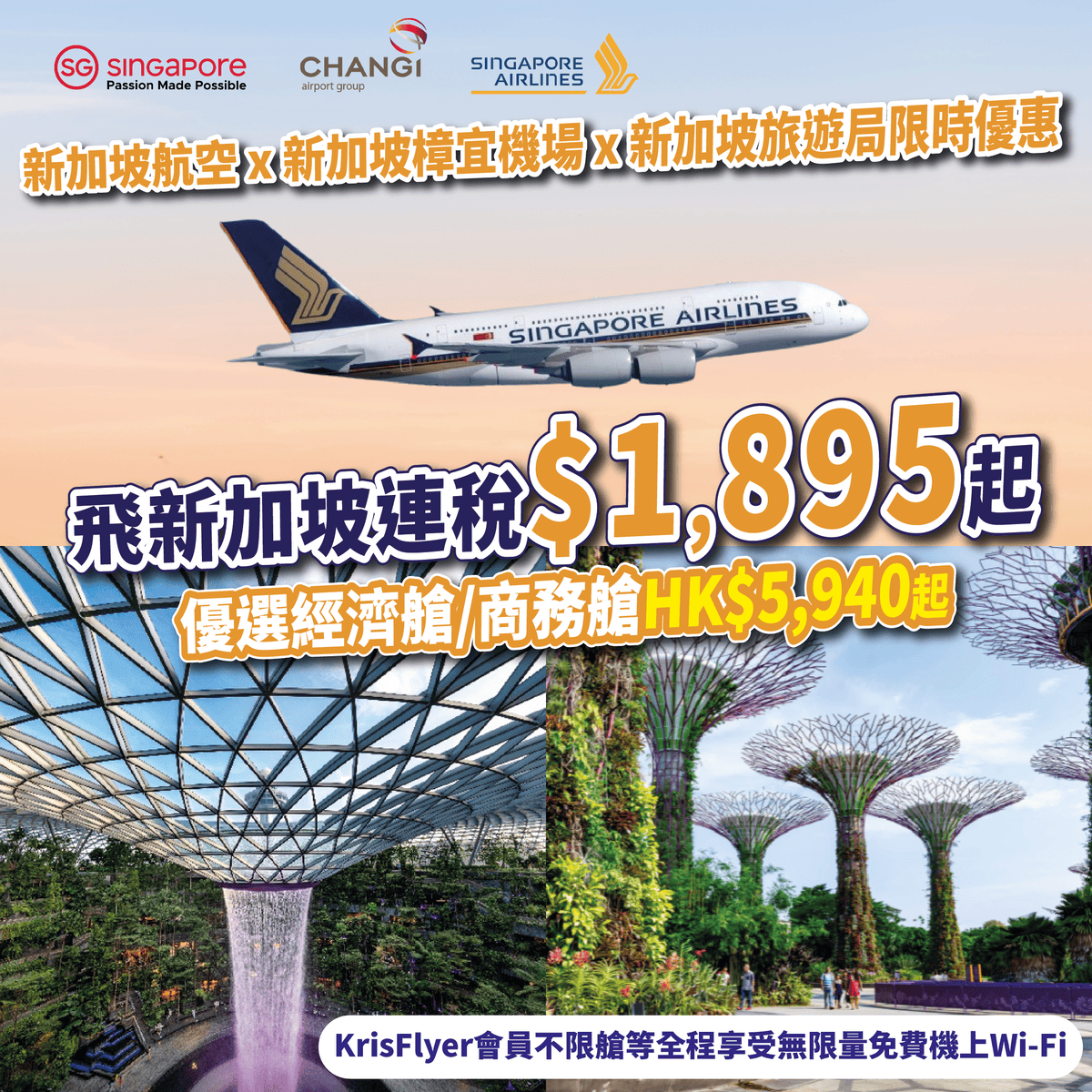 新加坡航空 x 新加坡樟宜機場 x 新加坡旅遊局限時優惠!香港飛新加坡來回連稅只需HK$1,895起、優選經濟艙/商務艙HK$5,940起!會員全程不限艙等無限量免費享用機上Wi-Fi!