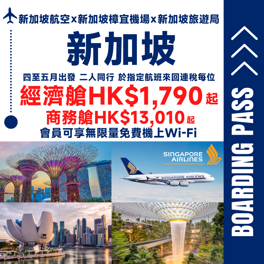 去旅行識揀當然係揀坐星級新加坡航空!航班可靠有信心!可以享受World Class flying experience,舒適嘅客艙體驗、優質嘅服務、高質餐飲等都令大家搭得舒適又滿意!嚟緊一於搭住星級新航出發去新加坡探索當地唔同景色、品嚐各種地道美食、體驗豐富文化!新加坡航空每日有六班機由香港出發,真正做到早機去/晚機返,班次夠頻密,Plan行程就更有彈性,等你玩盡每一日!