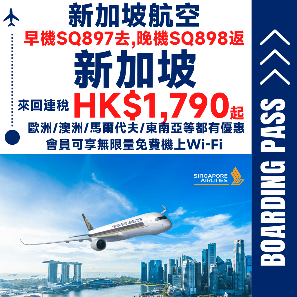 小編最鐘意坐新加坡航空!點解?因為航班可靠,俾到信心大家!仲可以享受World Class flying experience,舒適客艙體驗、優質嘅服務、高質餐飲等都令大家搭得舒適又滿意!嚟緊一於搭住星級新航出發去新加坡探索當地唔同景色、品嚐各種地道美食、體驗豐富文化!新加坡航空每日有六班機由香港出發,真正做到早機去/晚機返,班次夠頻密,Plan行程就更有彈性,想去邊就去邊!等你玩盡每一日!你都想搭新加坡航空去新加坡?咁仲唔快啲趁有優惠訂機票?