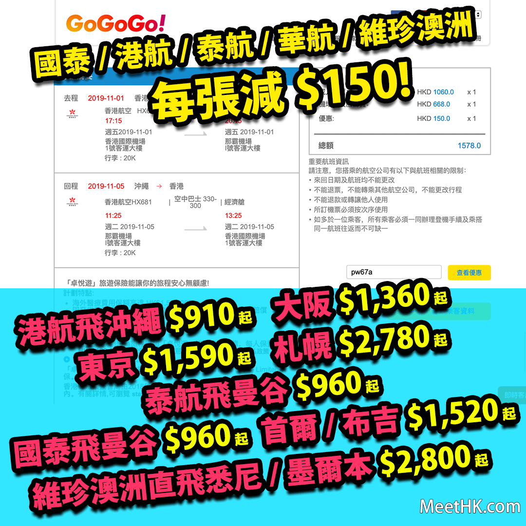 預訂香港出發機票單一簽賬淨值滿HK$3,000,可享HK$150「一扣即享」折扣 (名額600個)