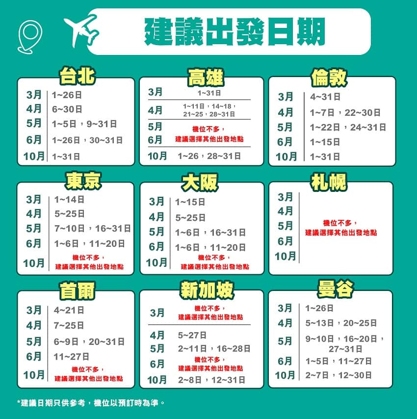 台北/高雄$750起;曼谷/新加坡$1,080起;首爾$1,230起;東京成田/大阪/札幌$1,800起;倫敦$3,000起