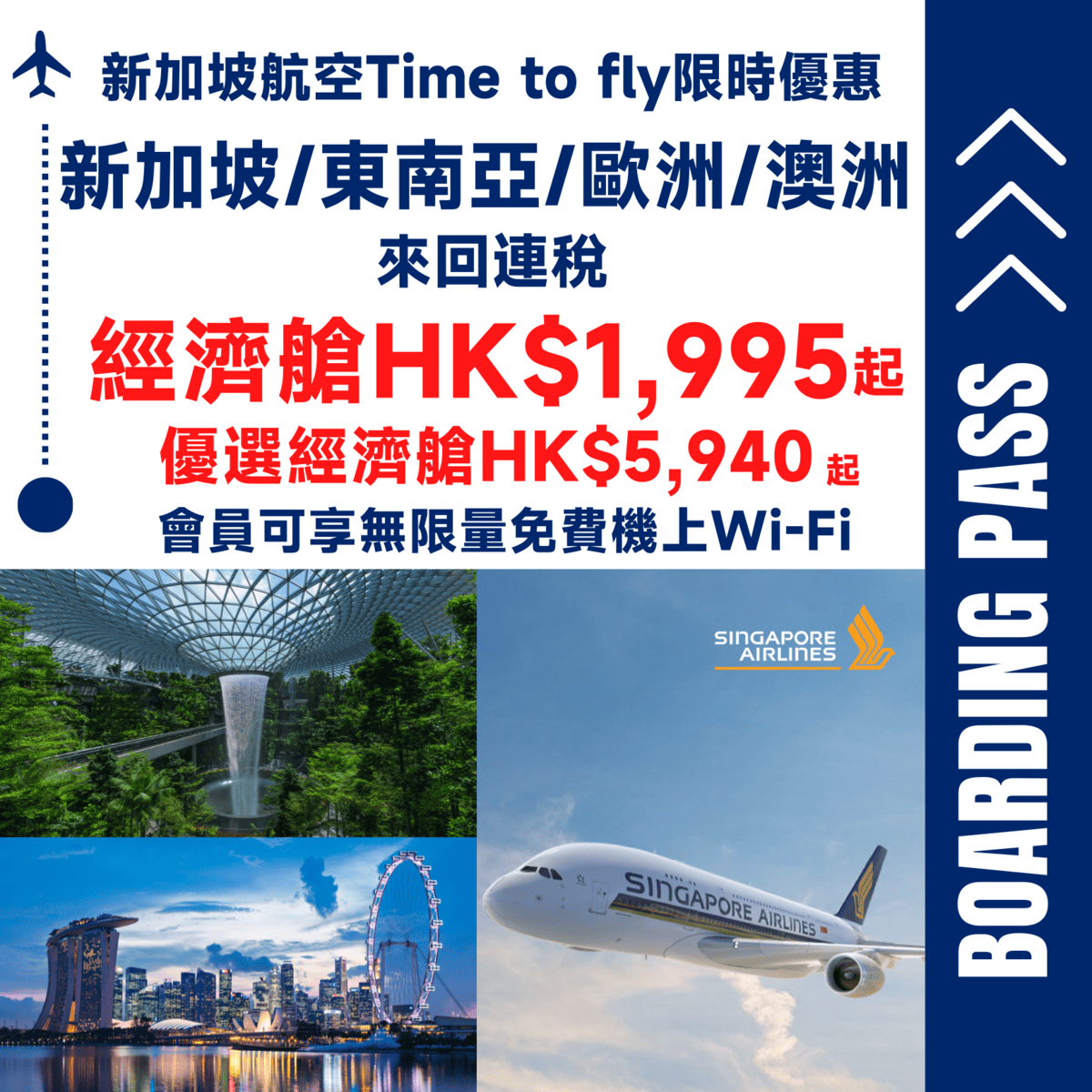 正呀!連稅千九起飛新加坡!新加坡航空Time to fly限時優惠!香港飛新加坡來回連稅只需HK$1,995起!KrisFlyer會員全程無限量免費享用機上Wi-Fi!
