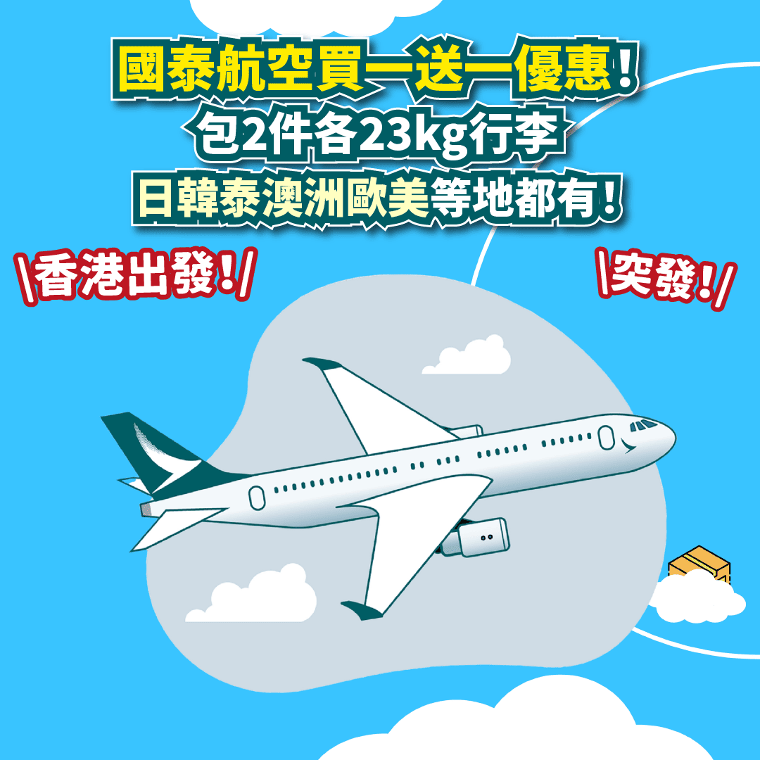 又有啦!國泰香港出發買一送一優惠!9大熱門航點日韓台泰英國等都有,包2件各23kg行李 – 國泰航空 (優惠至3月18日)