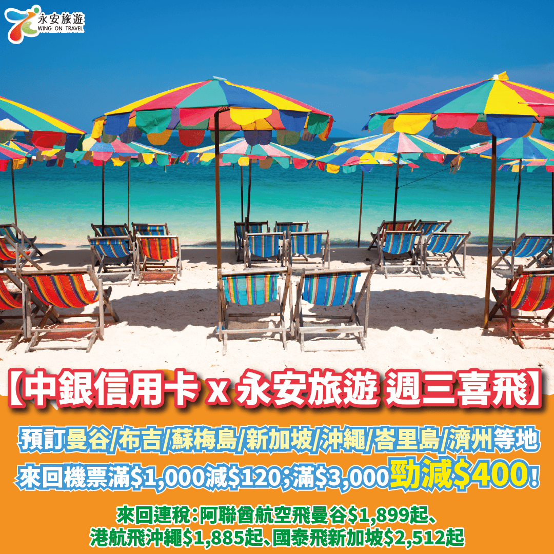 【中銀信用卡 x 永安旅遊 週三喜飛】曼谷/布吉/蘇梅島/新加坡/沖繩/峇里島/濟州等地來回機票滿$1,000即減$120、滿$3,000勁減$400!來回連稅:阿聯酋航空飛曼谷$1,899起、港航飛沖繩$1,885起、國泰飛新加坡$2,512起