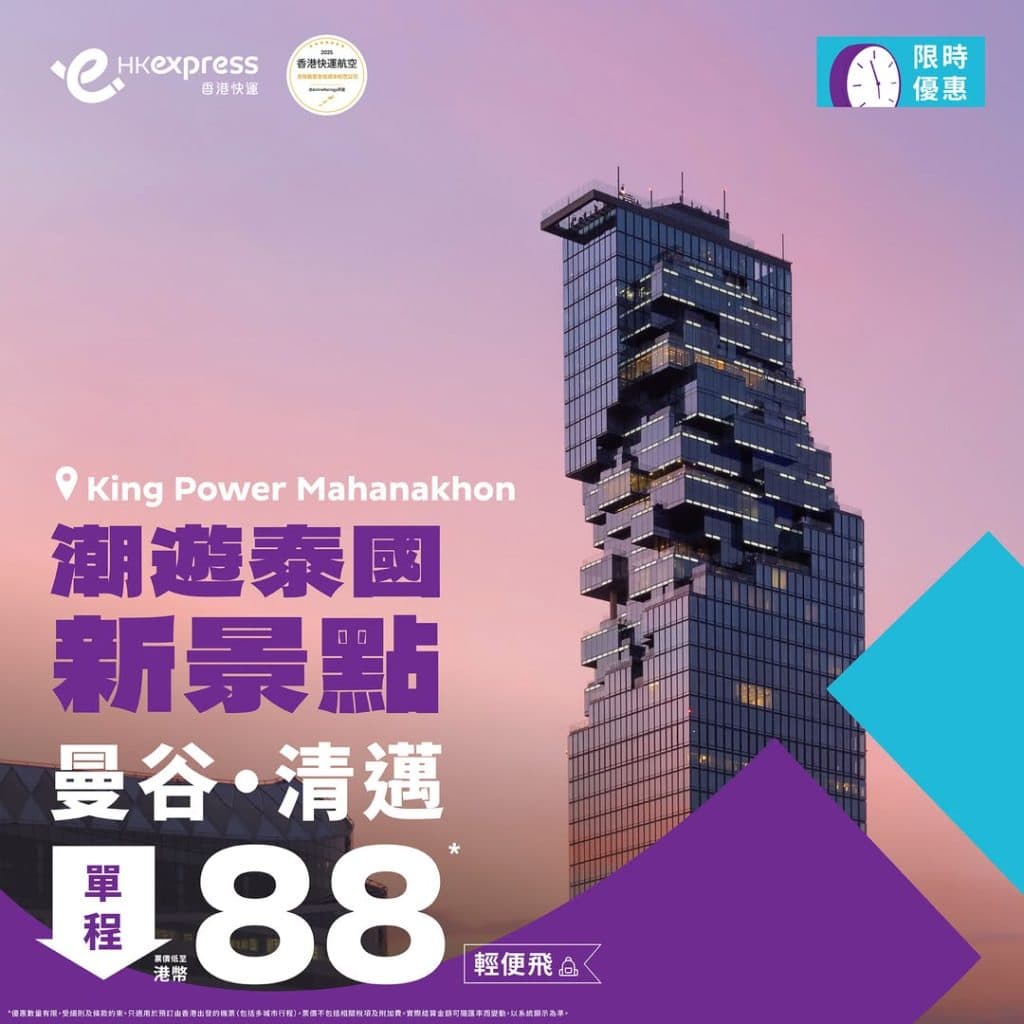 香港飛曼谷、清邁單程只需$88起,來回連稅$939起