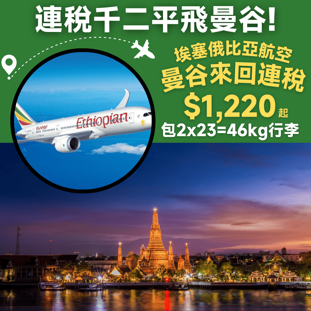 連稅千二平飛曼谷!包2件23kg=46kg行李!10月31日前出發!香港飛曼谷來回連稅只需$1,252起 – 埃塞俄比亞航空 (優惠至9月15日)