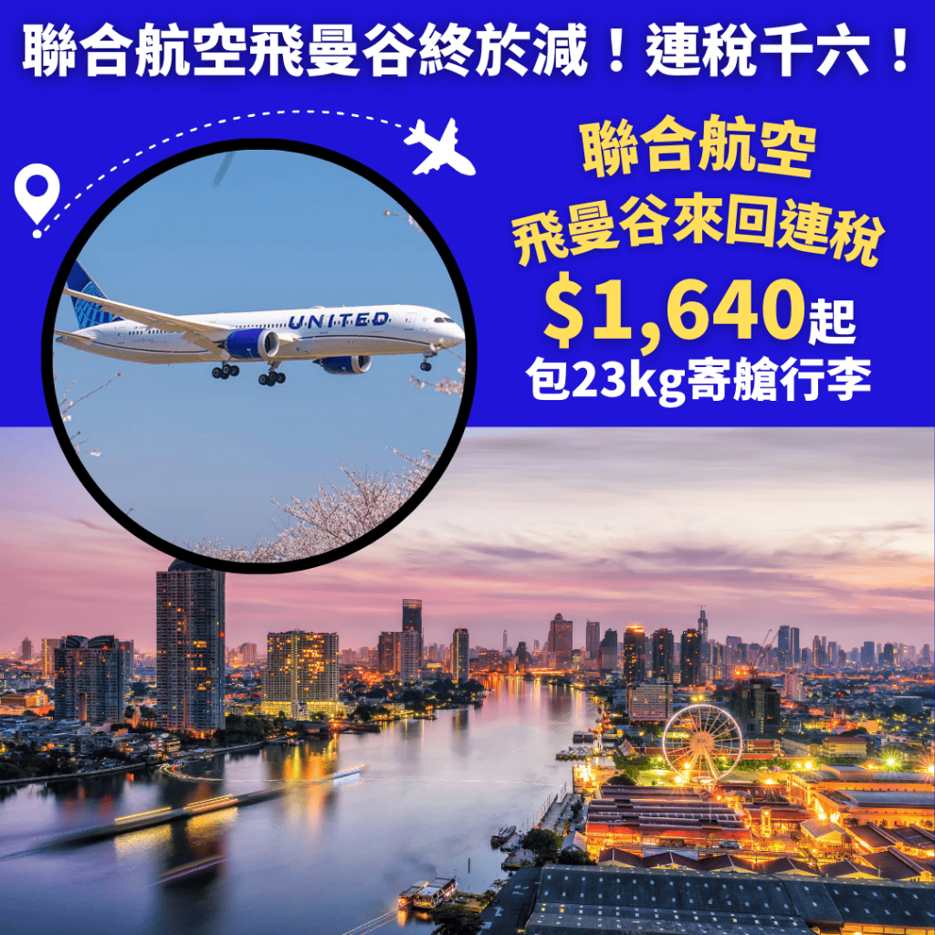 聯合航空飛曼谷終於減!連稅千六!明年7月8日前出發!香港飛曼谷來回連稅只需$1,640起 – 聯合航空