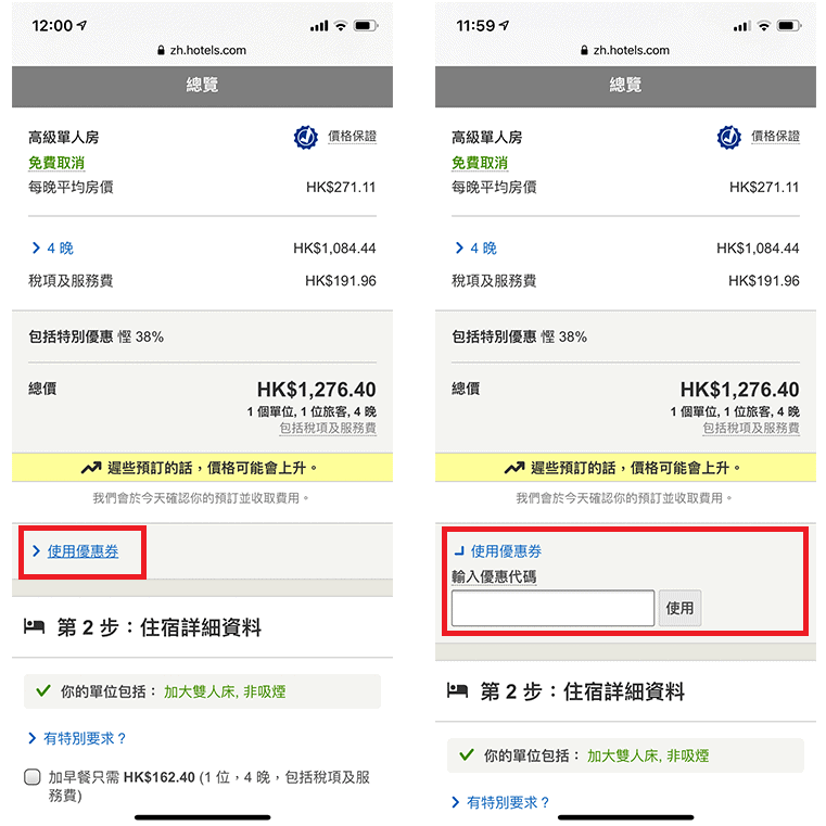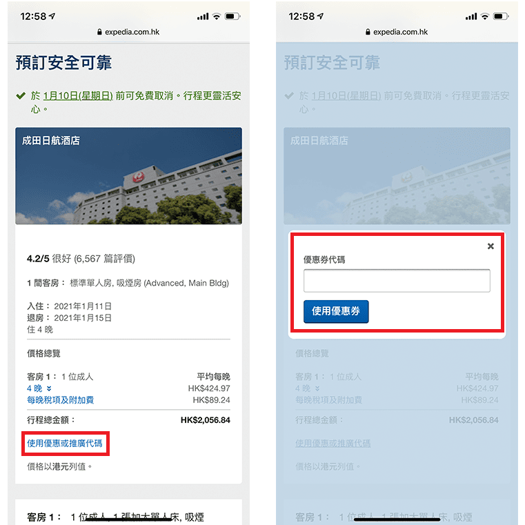 答:Hotels.com嘅優惠碼部分需要經指定連結預訂,撳入MeetHK提供嘅「預訂網站」揀選心水酒店同房型之後,於付款頁面撳「使用優惠券」然後輸入相應優惠碼就可以啦!成功使用會見到房間總價即時有變動,冇錯先好確認付款呀!