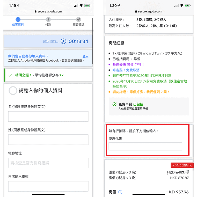 不過Agoda部份信用卡優惠並不需要輸入優惠碼,只要經指定連結去到付款頁面輸入正確信用卡號碼後先會自動顯示相關折扣。