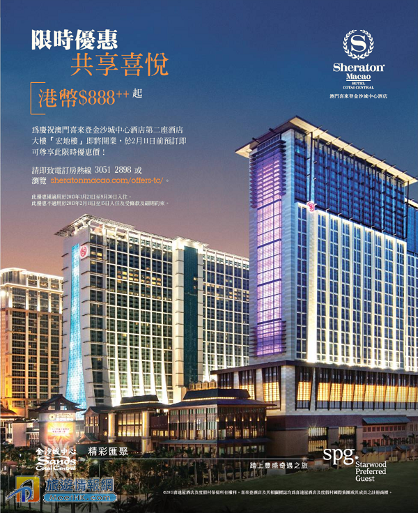 另外澳門喜來登金沙城中心酒店官網都可以訂到呢個優惠