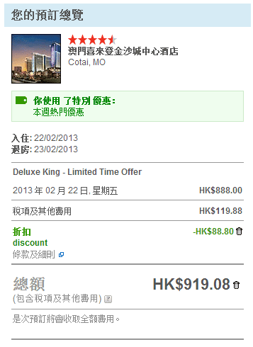 另外澳門金沙城中心假日酒店官網都可以訂到今次優惠,不過就無九折