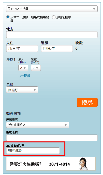 HotelClub 折扣代碼:REVIVE20 (6月30日前預訂有效)  (由於本折扣優惠代碼被眾多網站轉載,已經達限制數量,優惠已完結)