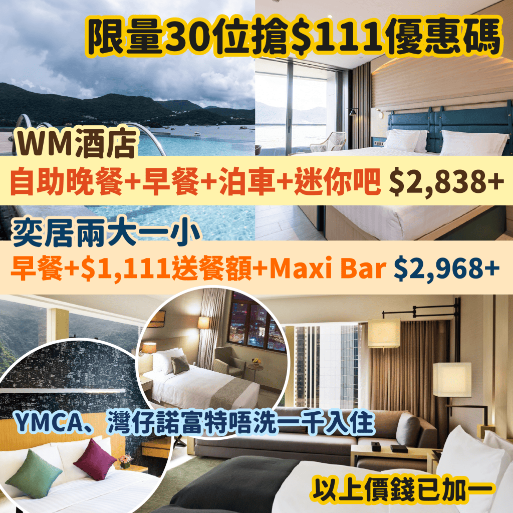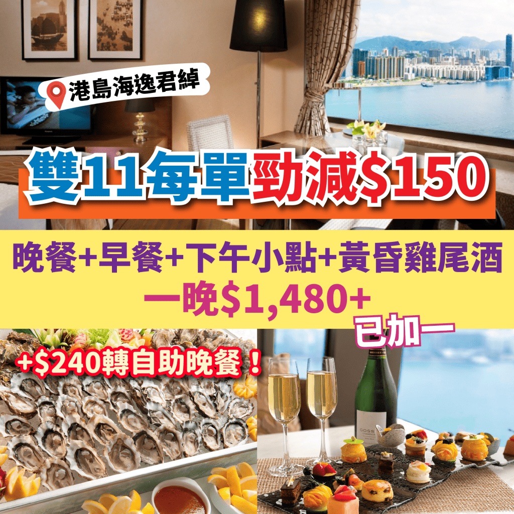 入住高級大床/雙床房一晚連服務費$1,199起(星期五至日入住$169),雙人早餐+雙人四道菜黯然銷魂飯套餐