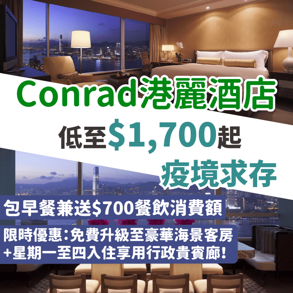 香港港麗酒店 (Conrad Hong Kong) 兩間房只需$2,000,平均每房$1,000 (名額10個)