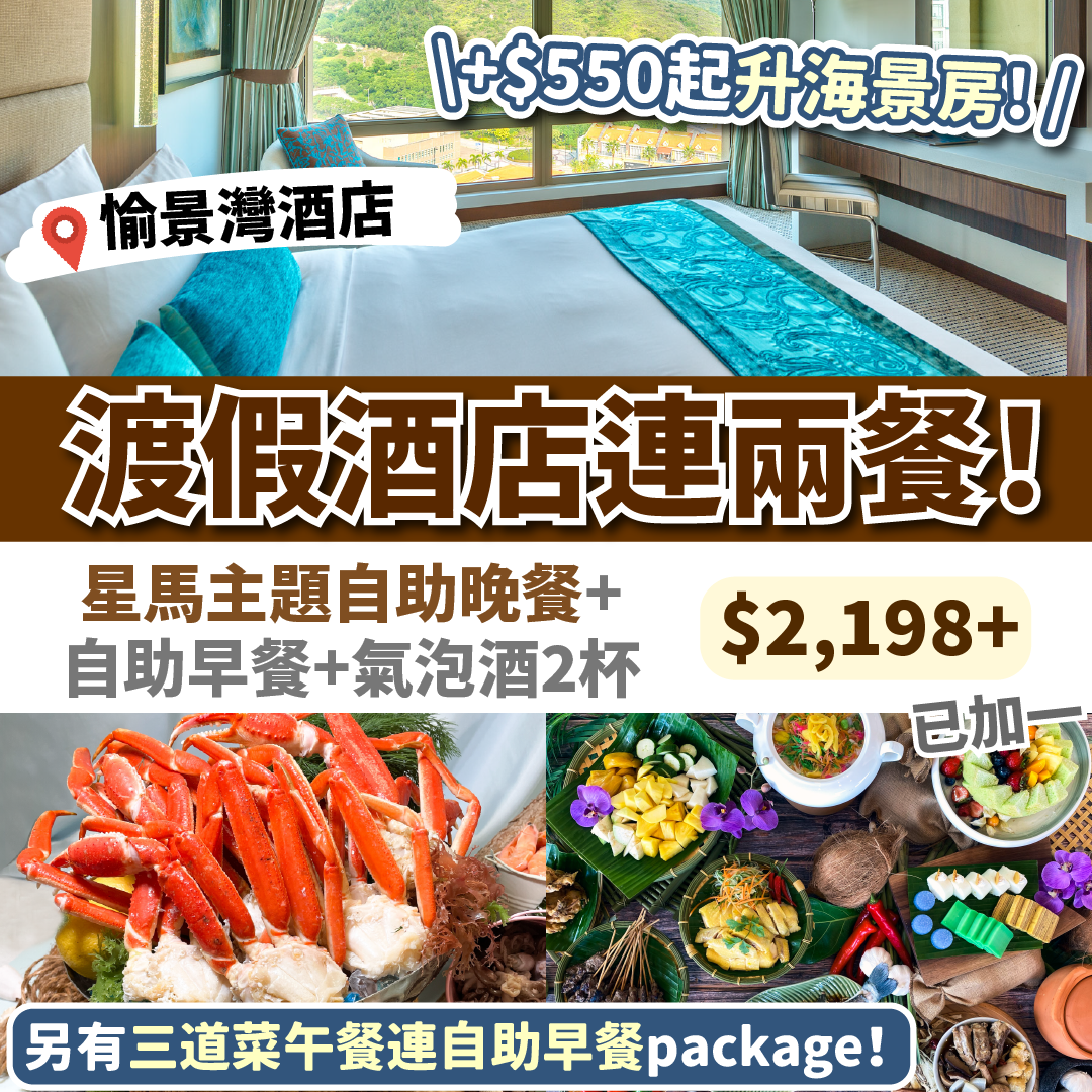 入住海景客房一晚連服務費$2,748起 (星期五入住貴$121起;星期六入住貴$341起;10月2-4日入住貴$671) - 入住當日享用雙人自助晚餐 (9-10月限定新加坡及馬來西亞主題) (供應時間:星期一至四: 06:00-09:30pm / 星期五至日及公眾假期: 05:45-07:45pm)