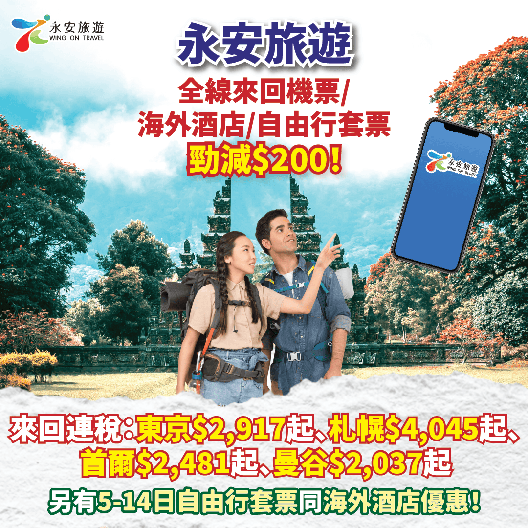 【永安旅遊 超級旅遊節2025】連續兩星期大激減!機票/酒店/自由行套票/旅行團/郵輪產品/機場快綫,全線勁減高達HK$3,000!限量搶$1金光飛航船票!