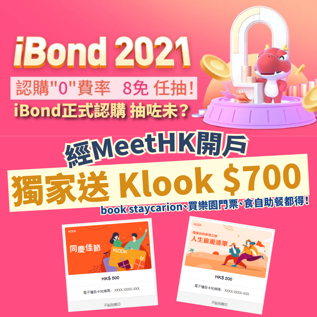 嗱嗱嗱!iBond今日正式開始認購啦!應該大家都喺到傾緊用咩抽!而家經MeetHK開華盛証券戶口,只要交易一次就送HK$700 Klook禮品卡,如果想抽iBond當迎新,就記得要賣咗先當交易呀,淨係抽咗唔計。話埋俾你知,用華盛抽iBond無論新舊客戶,都可以享有「8免」,即係免手續費、認購費、託管費、到期贖回費、經紀佣金、融資利息、交易佣金、存倉費!睇返上年,每人大約可以分配最多3-4手,所以認購4-5手就夠晒又穩陣。跟據往年經驗,上市後頭幾日即放每手都有三百蚊賺,基本上穩賺!計埋HK$700 Klook禮品卡,即放既話分分鐘可能有千幾蚊賺!