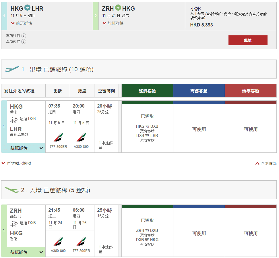 今次優惠去程香港至杜拜限坐 EK387/EK383