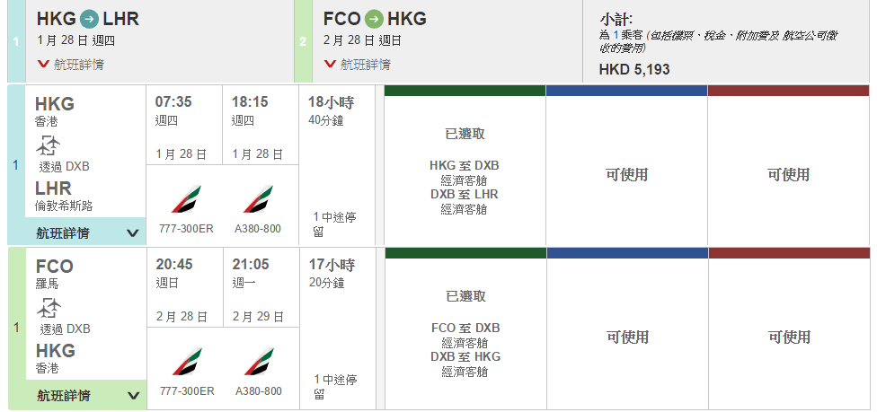 我地以11月12日香港飛杜拜,11月15日由杜拜飛倫敦,11月26日由羅馬走