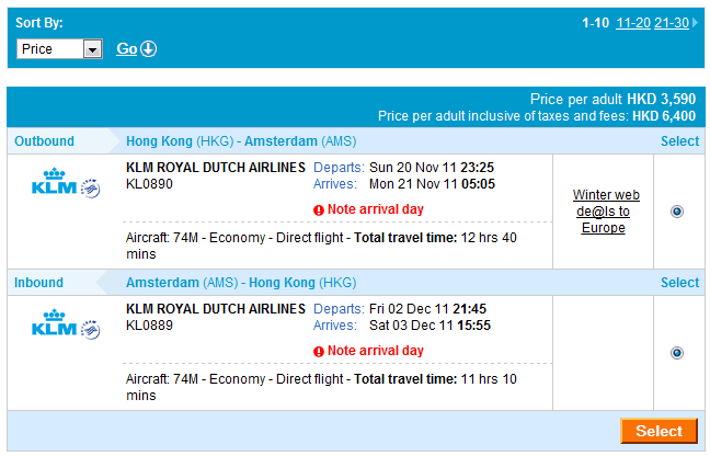 大家可以上 ZUJI HONG KONG 搜尋一下,我們就以香港來回阿姆斯特丹Amsterdam為例,11月20日去,12月2日返