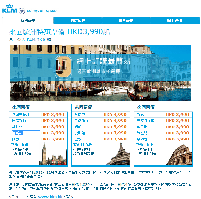 荷蘭皇家航空 KLM 推出了來回歐洲既機票優惠,來回阿姆斯特丹、巴塞羅那、都柏林、里斯本、倫敦、馬德里、曼徹斯特、米蘭、奧斯陸、巴黎、羅馬、斯德哥爾摩、威尼斯、維也納、 歐洲票價僅需$3,990起