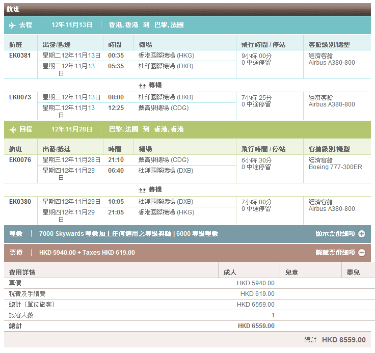 我們就以香港來回阿姆斯特丹Amsterdam為例,11月7日去,12月6日返