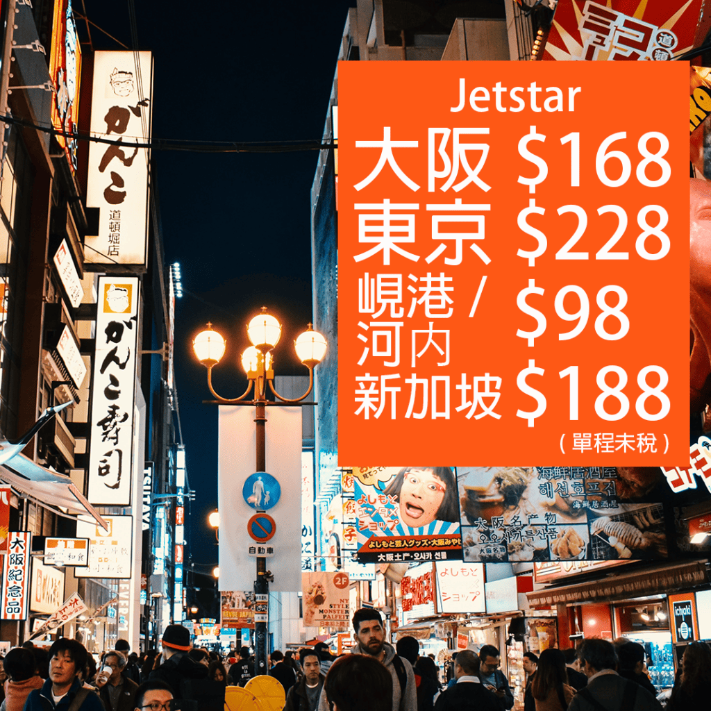 抵買!連稅八百飛大阪/東京!限時3日!單程低至$98!香港飛大阪單程只需$168起、東京$228起、峴港/河内$98起、新加坡$188起 – Jetstar (優惠至2月3日)
