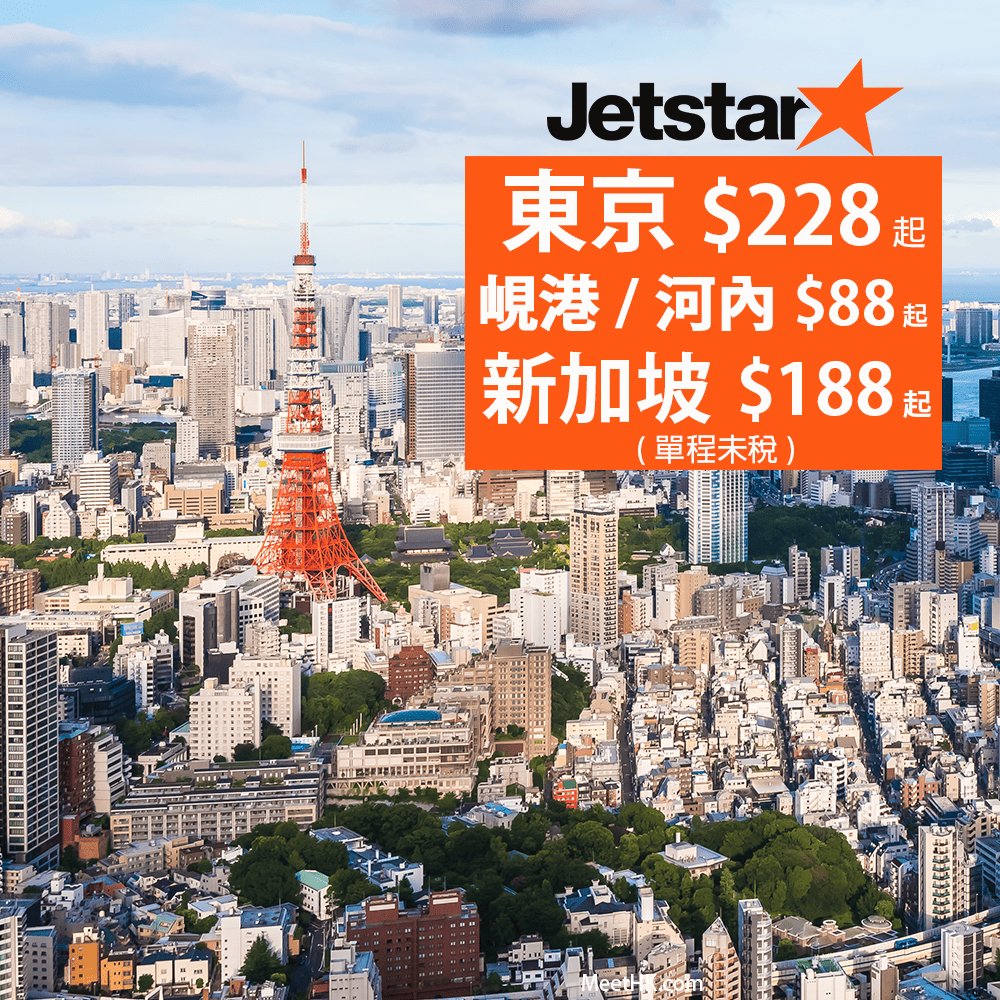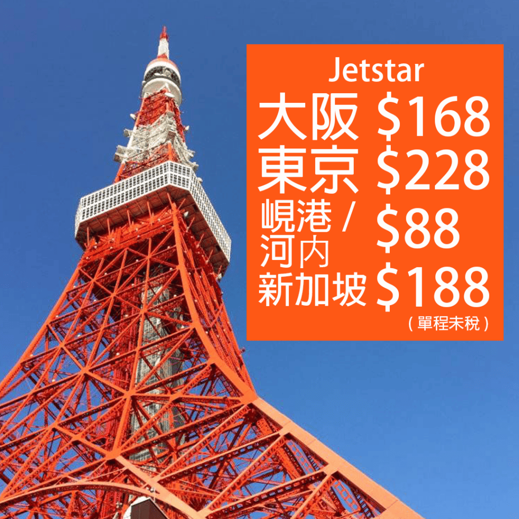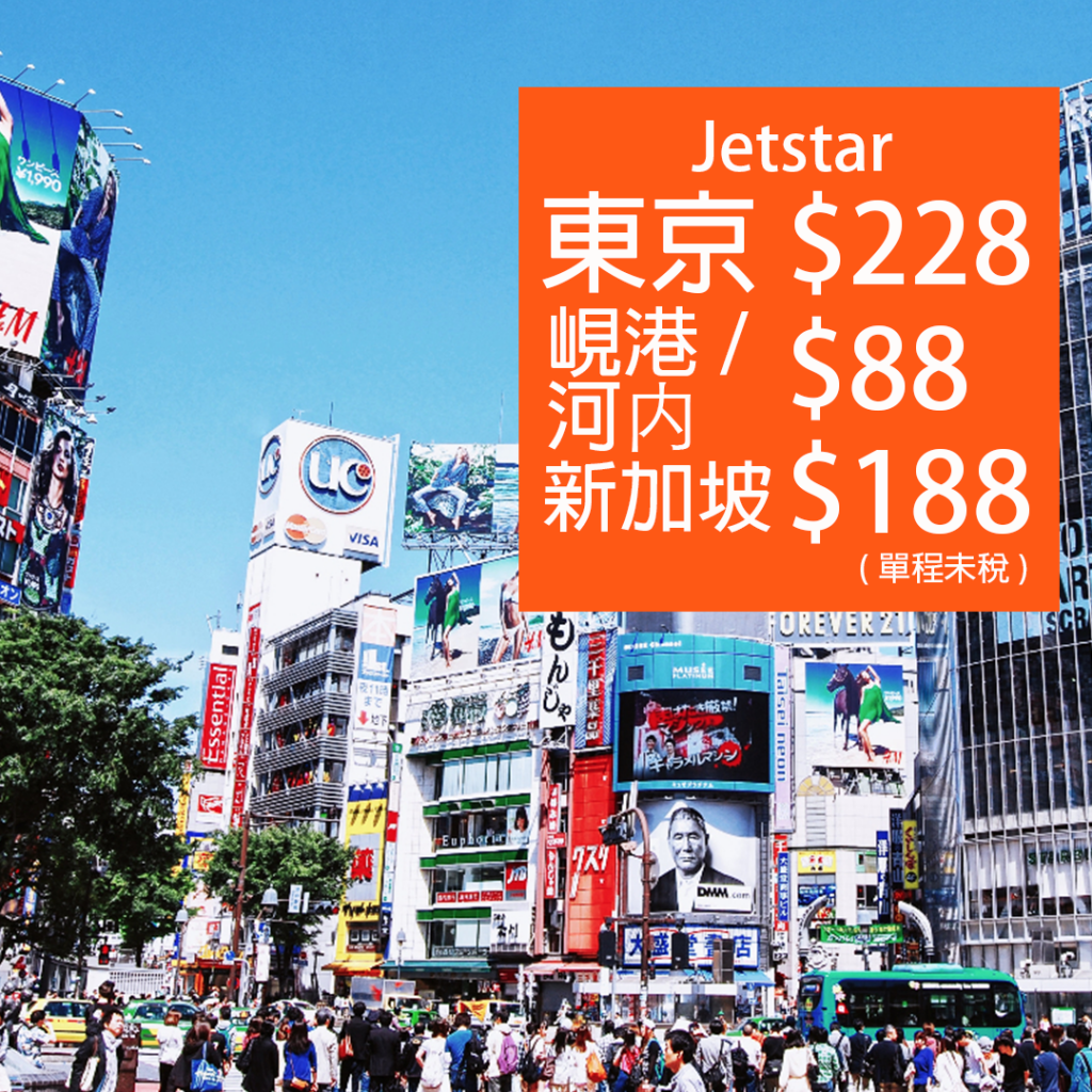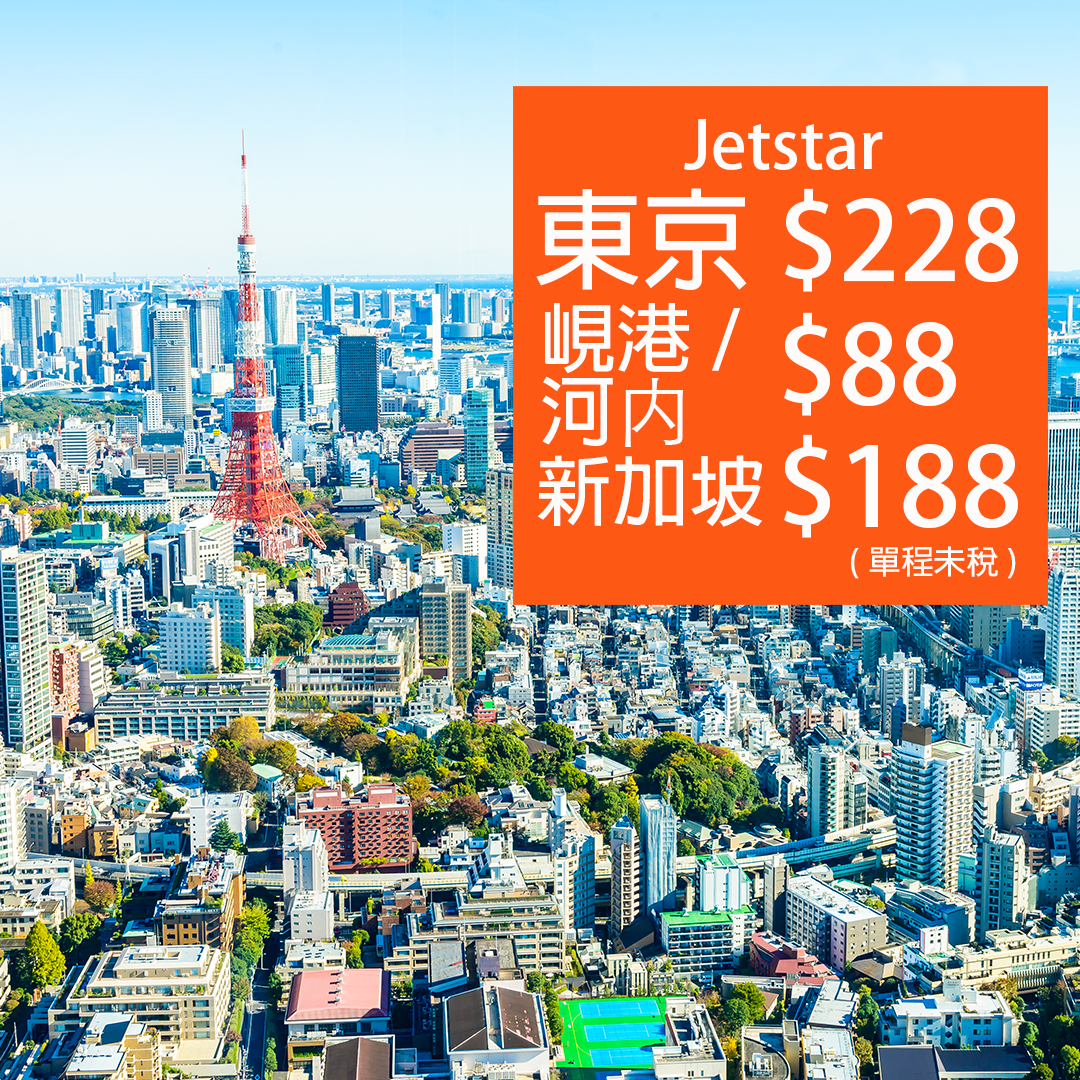 東京連稅九百!賣到10月份!香港飛東京單程只需$228起、峴港/河内$88起、新加坡$188起 – Jetstar (優惠至3月21日)