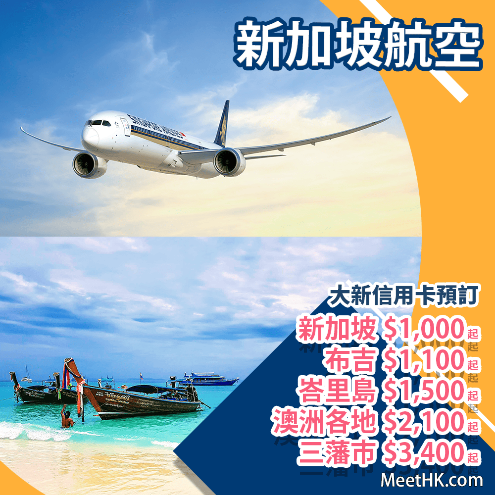 搭星級「新加坡航空」有平!大新信用卡專享!香港往返新加坡未連稅只需$1,000起,布吉$1,100起,峇里島$1,500起,澳洲各地$2,100起,三藩市$3,400起 (優惠至4月18日)