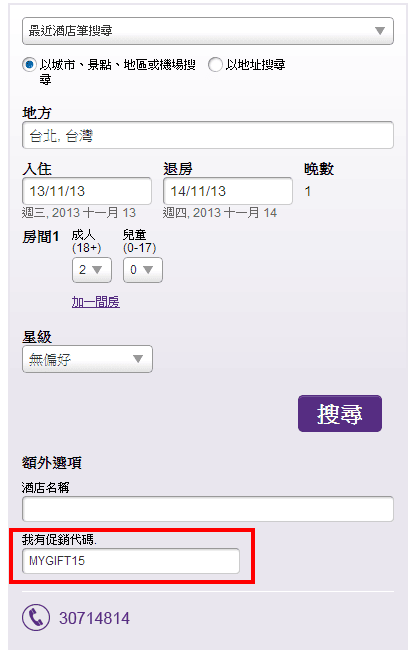 大家憑以下代碼在 HotelClub 預訂酒店,可享受額外15%的優惠 (2013年11月10日前預訂有效, 於2014年3月31日前入住)