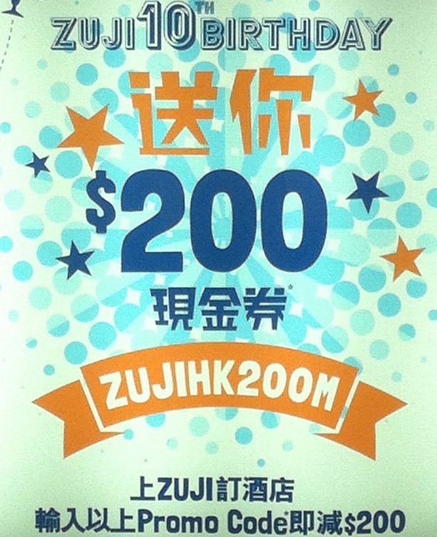 ZUJI Hong Kong 為慶祝10歲生日今日係巴士站同地鐵既廣告燈箱發放左一個酒店折扣優惠代碼