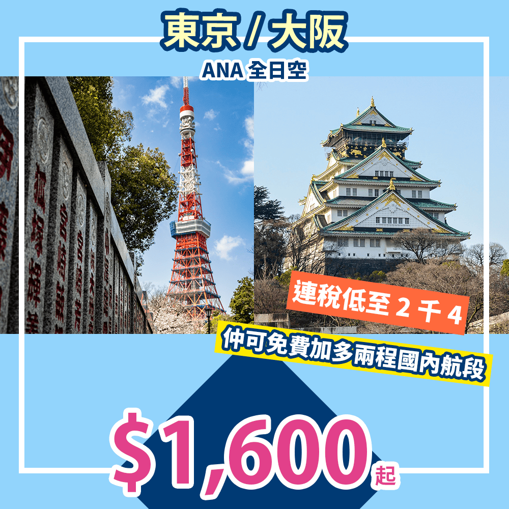 大阪$5,500起,連稅$6,427起、東京羽田$5,700起,連稅$6,592起、東京成田$5,700起,連稅$6,596起