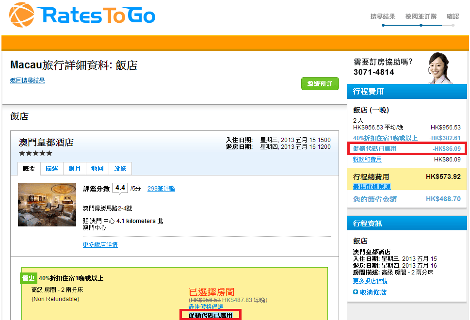 呢個折扣代碼唔適用於一些連鎖酒店集團,大家可以留意價錢下面有無顯示”可使用促銷代碼”